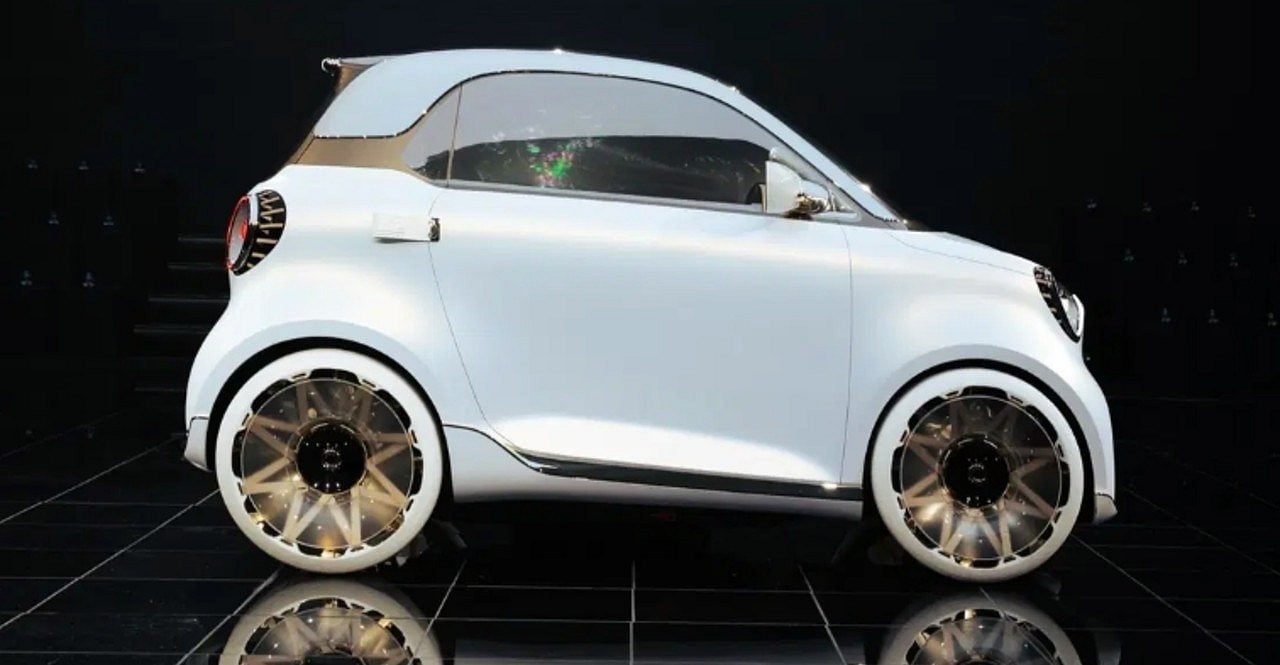 A Smart, joint venture entre Mercedes-Benz e Geely, desenvolveu uma arquitetura elétrica compacta própria para o projeto. O conceito mantém rodas nos quatro cantos, o que melhora o aproveitamento interno apesar do tamanho reduzido. O raio de giro fica em 6,95 metros, valor que facilita manobras em ruas estreitas e vagas apertadas de centro urbano.
