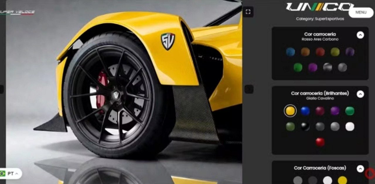 O Super Veloce Unico ganhou um configurador virtual aberto ao público. O supercarro brasileiro permite que interessados escolham cores, faixas, interior e rodas diretamente no site da marca. A ferramenta simula a experiência de jogos de corrida. A primeira unidade do modelo será entregue em maio.